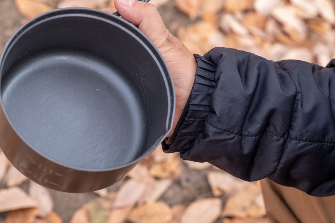 Die Beschichtung macht das Abwischen nach dem Kochen einfach und sauber, was in den Bergen, wo es kein Wasser gibt, ein großer Vorteil ist.