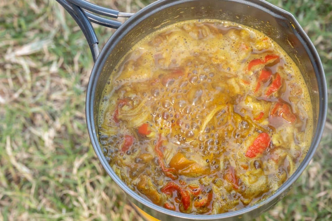 Sie können Ihr eigenes würziges Curry zubereiten! Man kann ein Retortencurry aufwärmen.