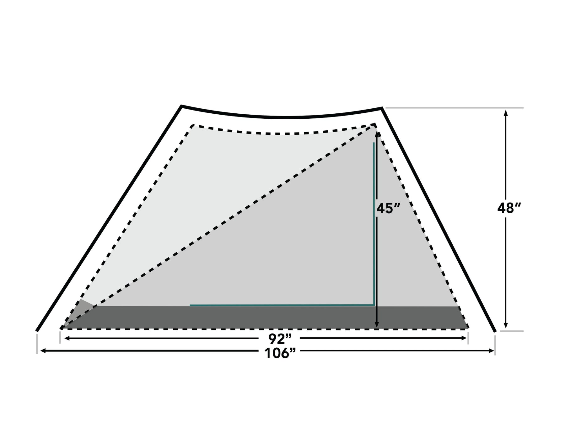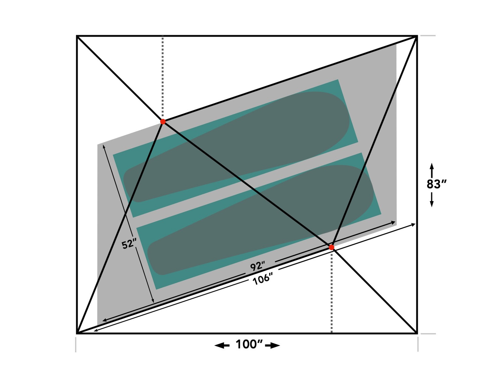 Patentiere X-Mid-Geometrie: konsistente Wandneigungen (ca. 50–55°) für Wind- & Schneelast – viel Kopffreiheit dank versetzter Stützstangen.